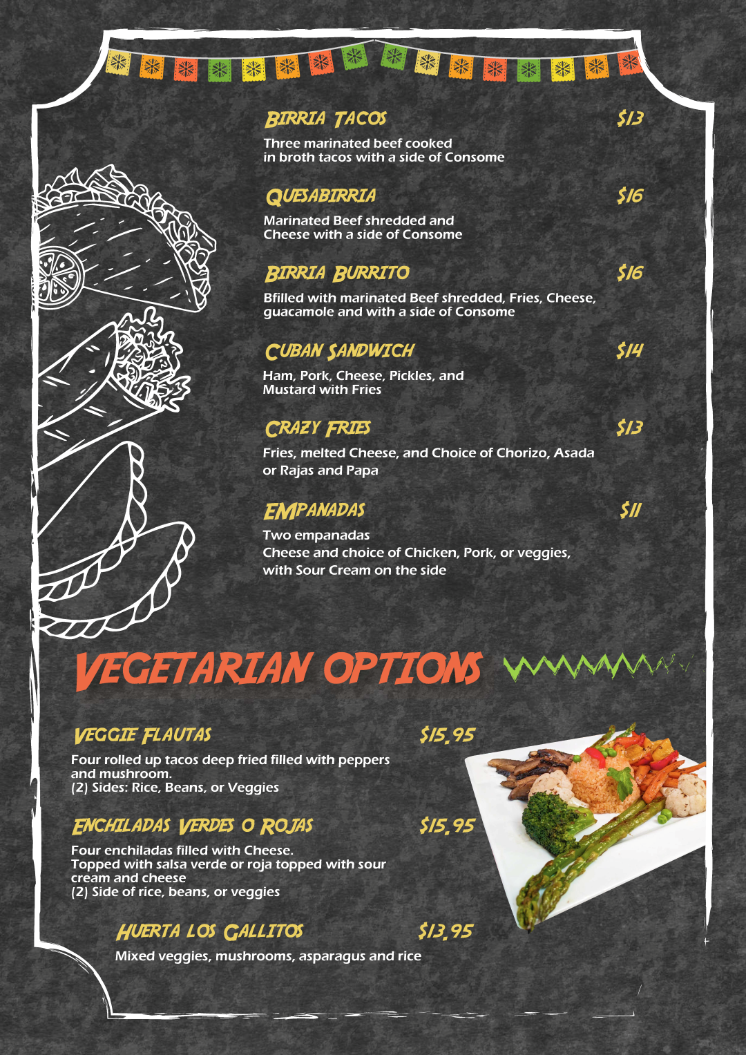 Our taqueria is the heart of Los Gallitos. Here, tacos are prepared with love and dedication, using fresh ingredients and traditional Mexican recipes. From classic tacos al pastor to innovative options with Mediterranean touches, every bite is a celebration of flavors.